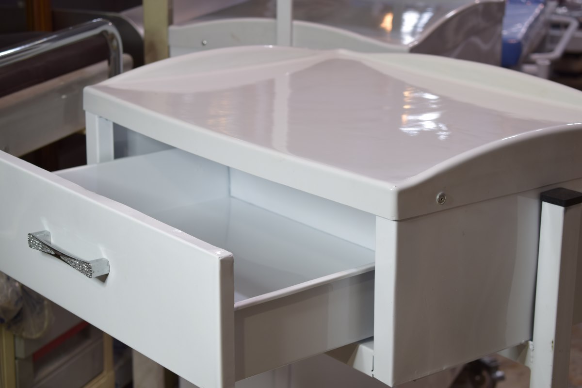 همراه با پوشش رنگ الکترواستاتیک برای افزایش کیفیت زیبایی ترالی پزشکی و همچنین قابلیت ضدعفونی و با محصول های شوینده بیمارستانی.